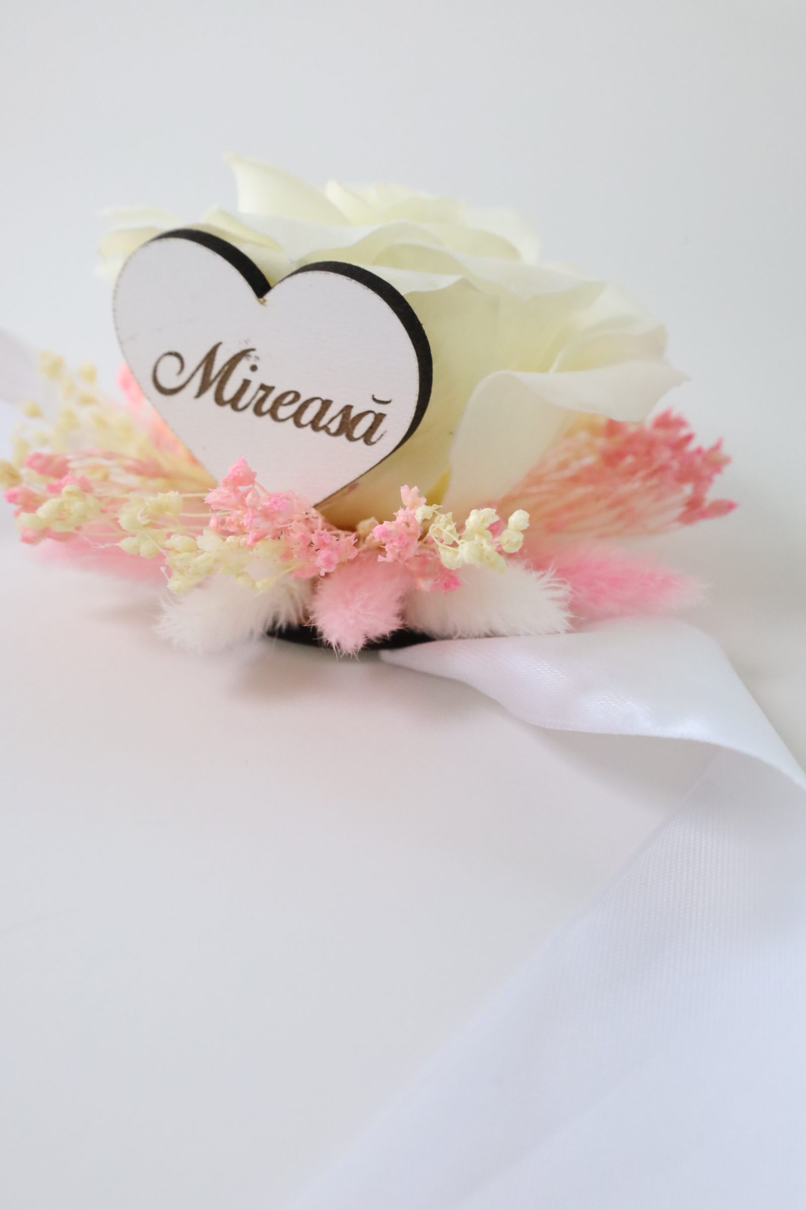 Corsaj pentru încheietura mâinii,paglica de saten ,trandafir de săpun și flori pentru petrecerea de nuntă,personalizarea este inclusa in pret trebuie doar sa ne specificati in descriere textul