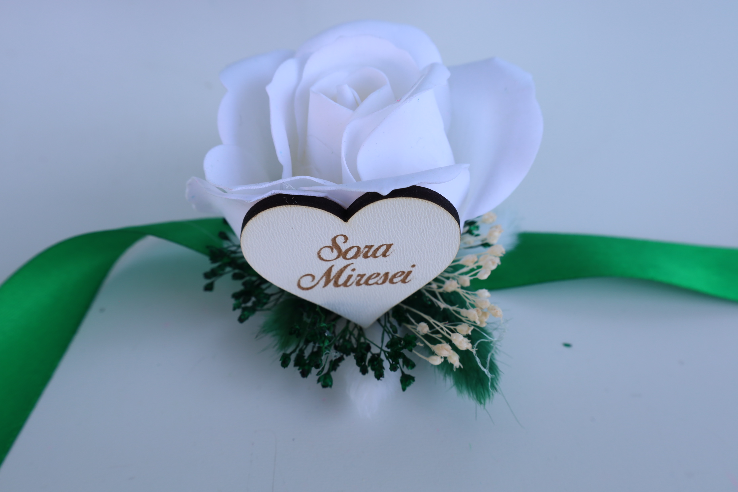 Corsaj pentru încheietura mâinii,paglica de saten ,trandafir de săpun și flori pentru petrecerea de nuntă,personalizarea este inclusa in pret trebuie doar sa ne specificati in descriere textul