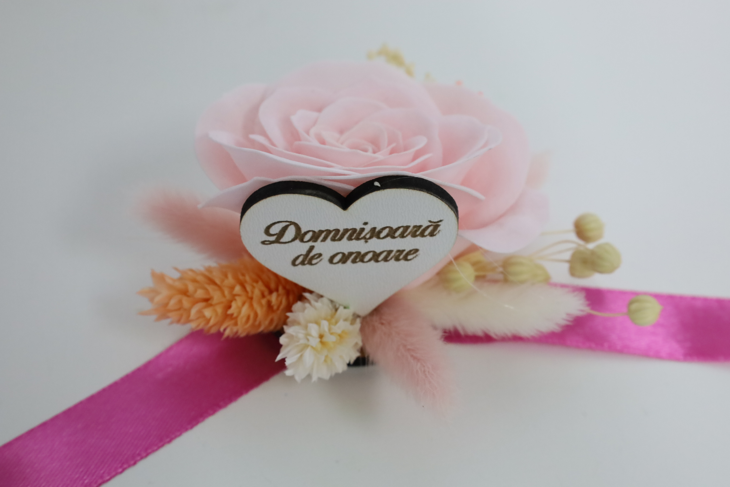 Corsaj pentru încheietura mâinii,paglica de saten ,trandafir de săpun și flori pentru petrecerea de nuntă,personalizarea este inclusa in pret trebuie doar sa ne specificati in descriere textul