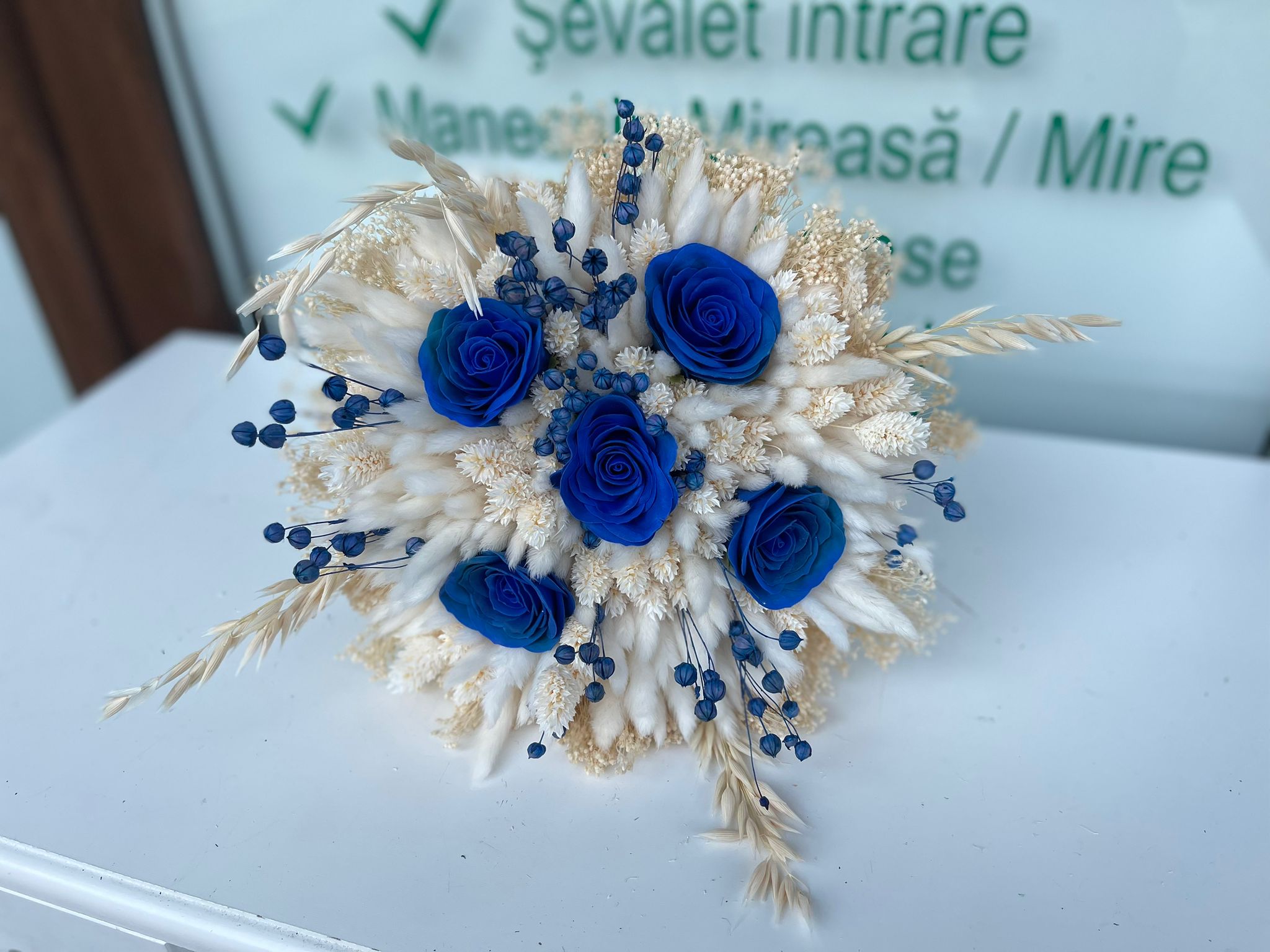 Intr-unul dintre cele mai frumoase momente din viata ta, trebuie sa ai o amintiri fabuloasa care va avea puterea de a reflecta seara ta speciala. Acest buchet poate fi tinut atat de mireasa, cat si de nasa, pastrandu-si multi ani indelungati aspectul si culoarea. Buchetul contine trandafiri de sapun,flori uscate/stabilizate si o funda mare . Acest buchet unic poate fi tinut in mana usor deoarece este realizat cu mare atentie si cu miscari lente pentru a crea un design aspectos si frumos.
