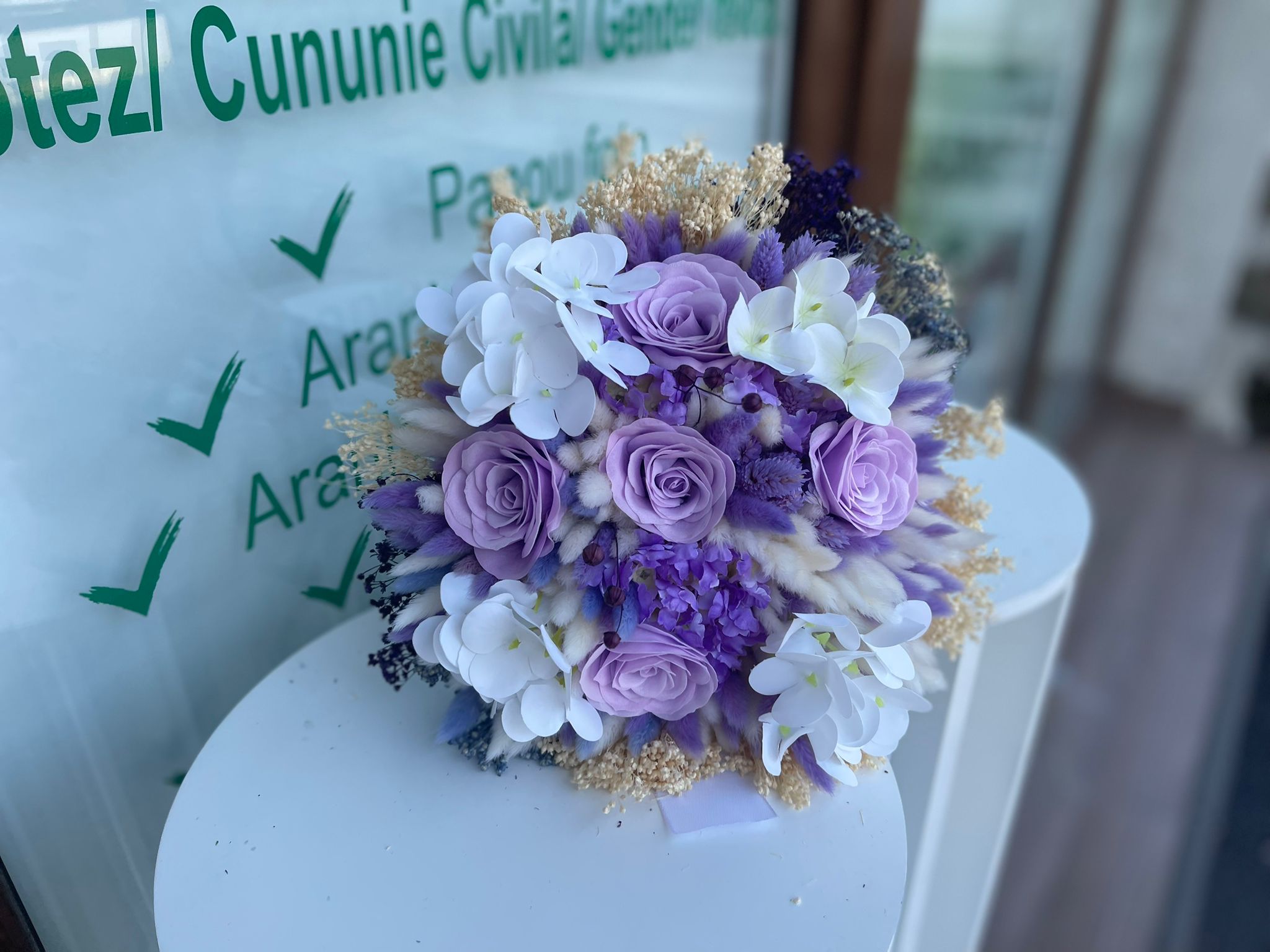 Intr-unul dintre cele mai frumoase momente din viata ta, trebuie sa ai o amintiri fabuloasa care va avea puterea de a reflecta seara ta speciala. Acest buchet poate fi tinut atat de mireasa, cat si de nasa, pastrandu-si multi ani indelungati aspectul si culoarea. Buchetul contine trandafiri de sapun,flori uscate/stabilizate si o funda mare . Acest buchet unic poate fi tinut in mana usor deoarece este realizat cu mare atentie si cu miscari lente pentru a crea un design aspectos si frumos.