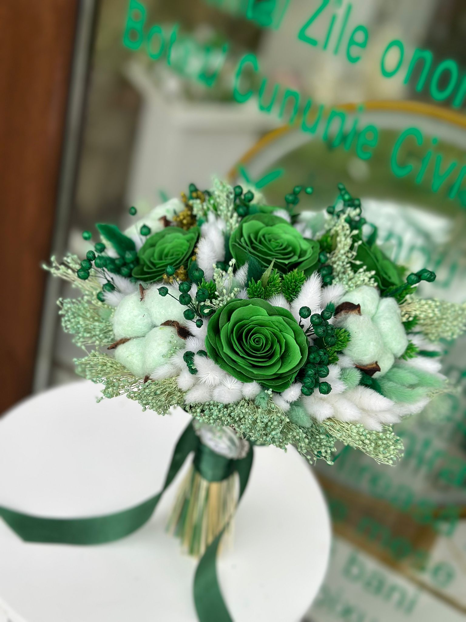 Intr-unul dintre cele mai frumoase momente din viata ta, trebuie sa ai o amintiri fabuloasa care va avea puterea de a reflecta seara ta speciala. Acest buchet poate fi tinut atat de mireasa, cat si de nasa, pastrandu-si multi ani indelungati aspectul si culoarea. Buchetul contine trandafiri de sapun,flori uscate/stabilizate si o funda mare . Acest buchet unic poate fi tinut in mana usor deoarece este realizat cu mare atentie si cu miscari lente pentru a crea un design aspectos si frumos.