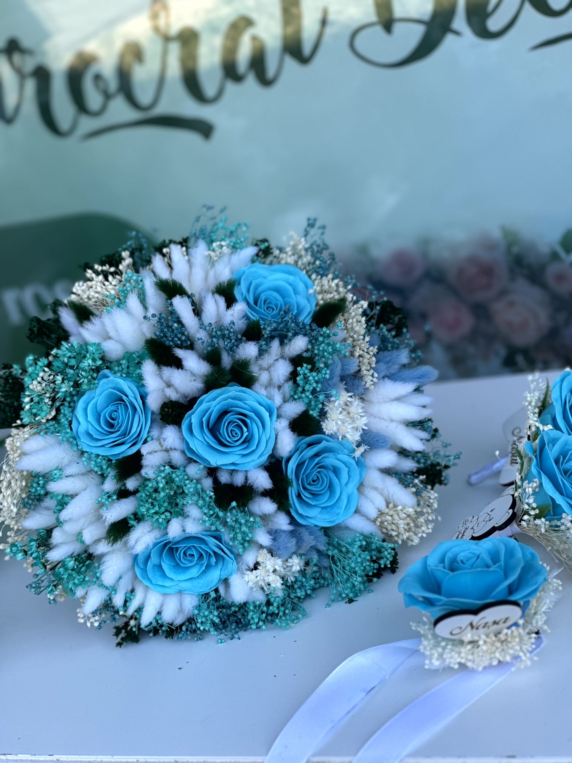 Intr-unul dintre cele mai frumoase momente din viata ta, trebuie sa ai o amintiri fabuloasa care va avea puterea de a reflecta seara ta speciala. Acest buchet poate fi tinut atat de mireasa, cat si de nasa, pastrandu-si multi ani indelungati aspectul si culoarea. Buchetul contine trandafiri de sapun,flori uscate/stabilizate si o funda mare . Acest buchet unic poate fi tinut in mana usor deoarece este realizat cu mare atentie si cu miscari lente pentru a crea un design aspectos si frumos.