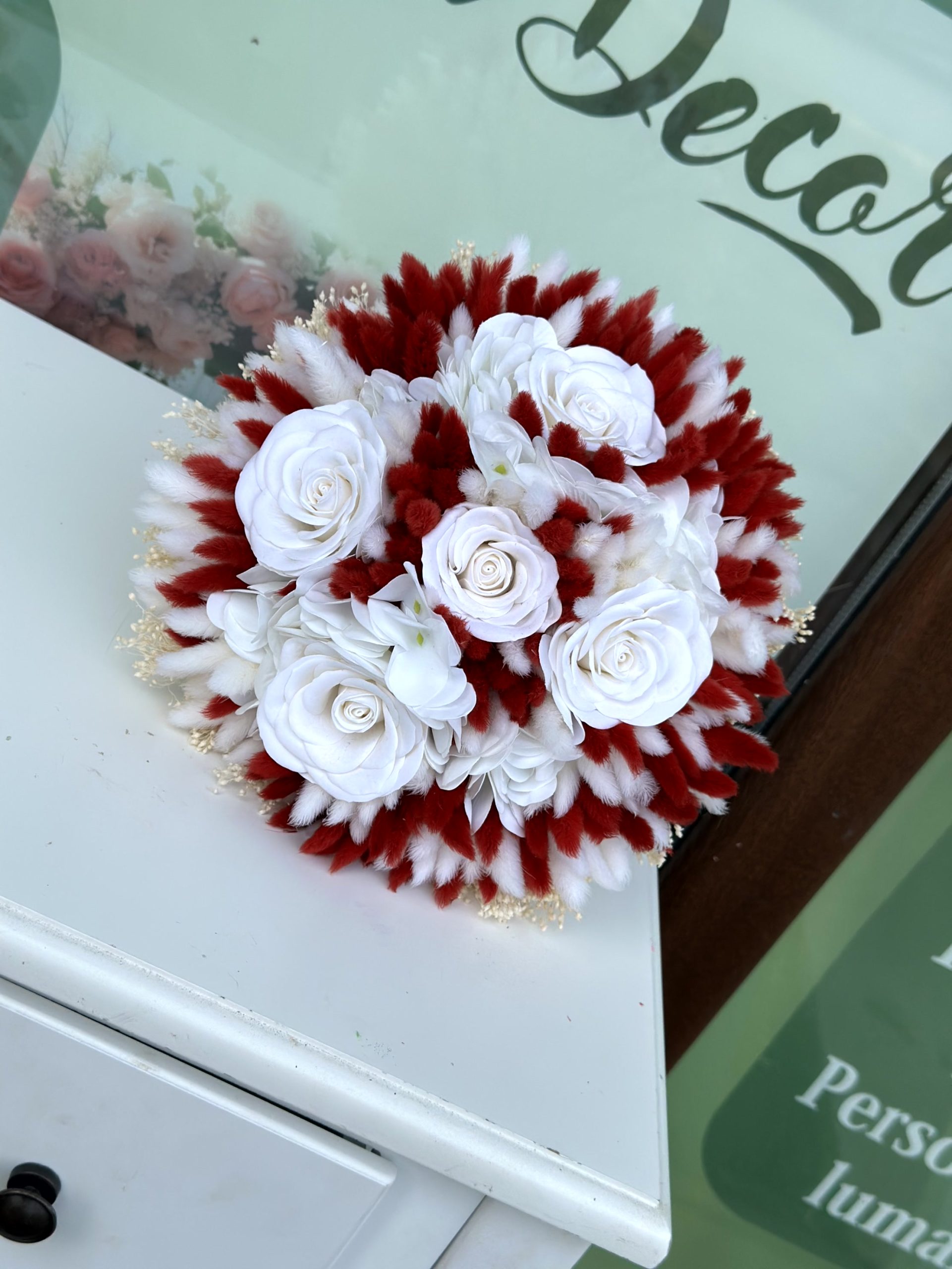 Intr-unul dintre cele mai frumoase momente din viata ta, trebuie sa ai o amintiri fabuloasa care va avea puterea de a reflecta seara ta speciala. Acest buchet poate fi tinut atat de mireasa, cat si de nasa, pastrandu-si multi ani indelungati aspectul si culoarea. Buchetul contine trandafiri de sapun,flori uscate/stabilizate si o funda mare . Acest buchet unic poate fi tinut in mana usor deoarece este realizat cu mare atentie si cu miscari lente pentru a crea un design aspectos si frumos.