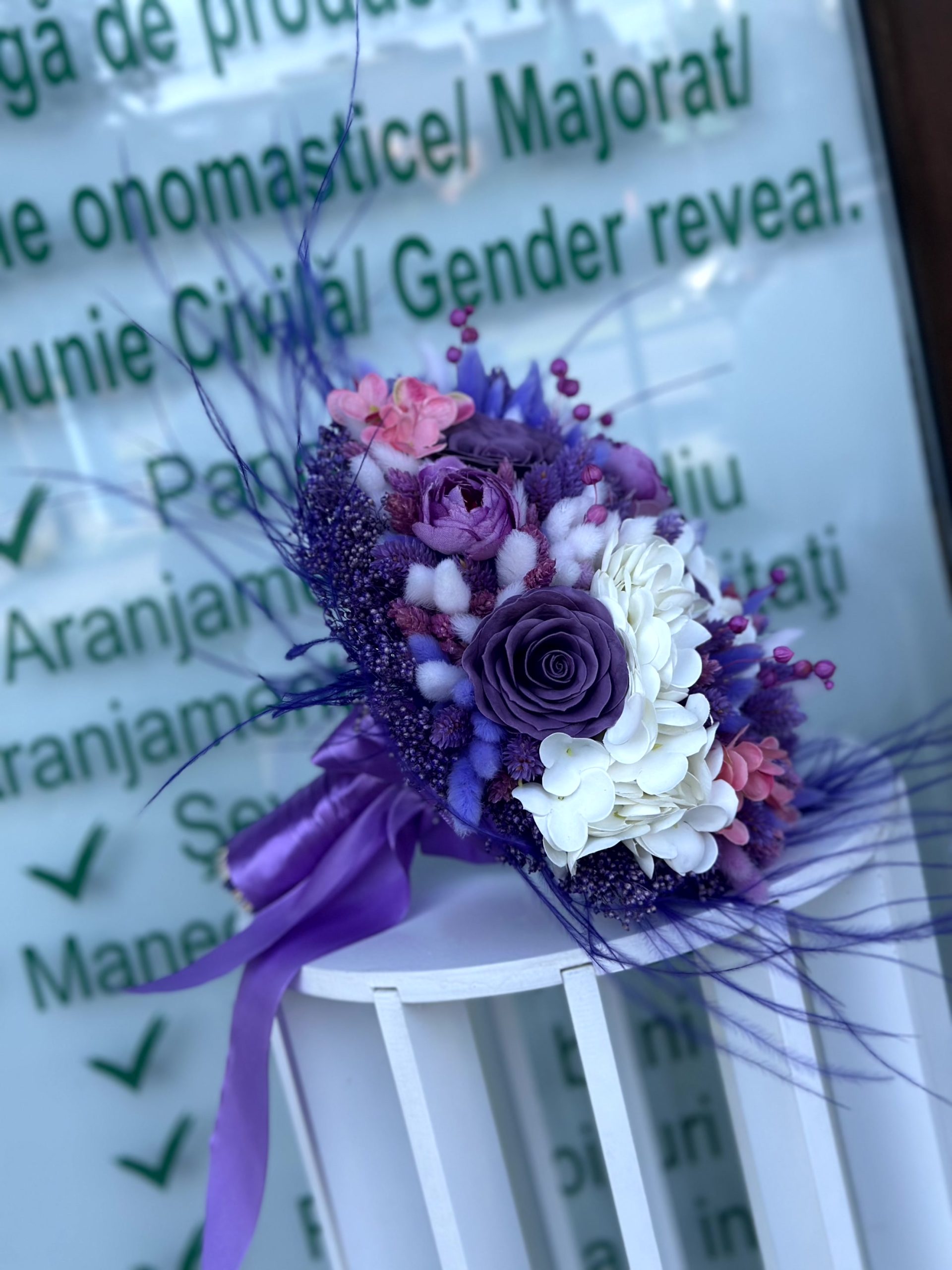Intr-unul dintre cele mai frumoase momente din viata ta, trebuie sa ai o amintiri fabuloasa care va avea puterea de a reflecta seara ta speciala. Acest buchet poate fi tinut atat de mireasa, cat si de nasa, pastrandu-si multi ani indelungati aspectul si culoarea. Buchetul contine trandafiri de sapun,flori uscate/stabilizate si o funda mare . Acest buchet unic poate fi tinut in mana usor deoarece este realizat cu mare atentie si cu miscari lente pentru a crea un design aspectos si frumos.
