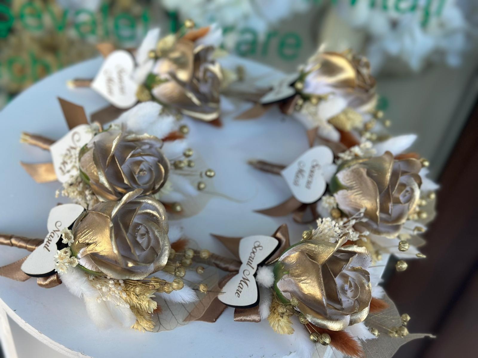 Cocarda nunta din trandafir de sapun marime (3-4 cm diametru) si plante/ flori naturale stabilizate, realizate special pentru a completa tinuta eleganta a invitatilor de la nunta.