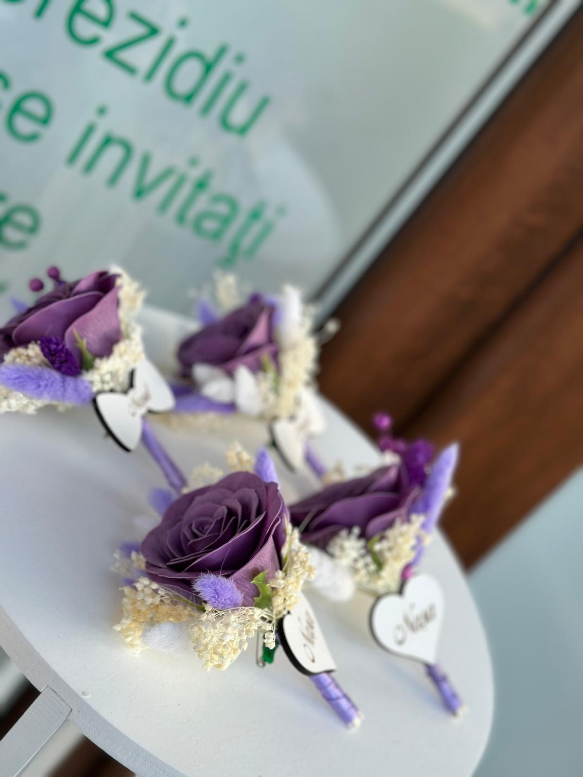 Cocarda nunta din trandafir de sapun marime (3-4 cm diametru) si plante/ flori naturale stabilizate, realizate special pentru a completa tinuta eleganta a invitatilor de la nunta.