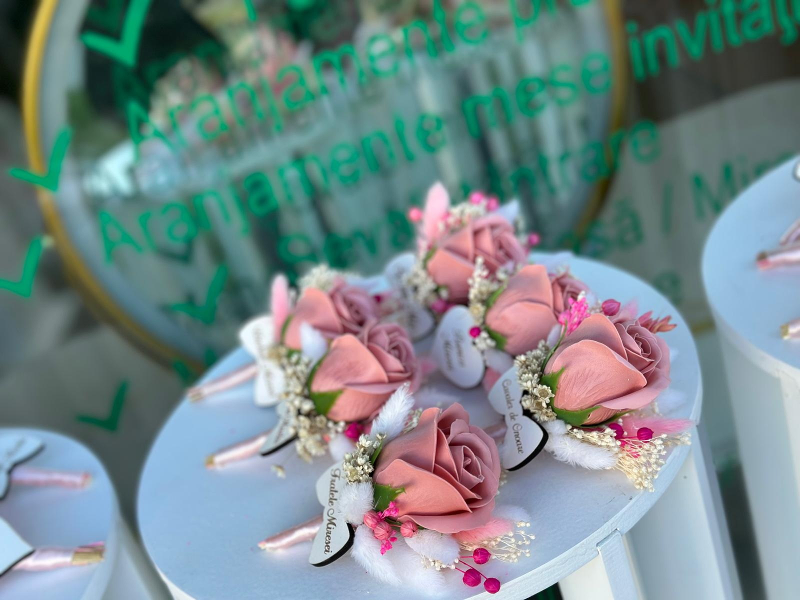Cocarda nunta din trandafir de sapun marime (3-4 cm diametru) si plante/ flori naturale stabilizate, realizate special pentru a completa tinuta eleganta a invitatilor de la nunta.