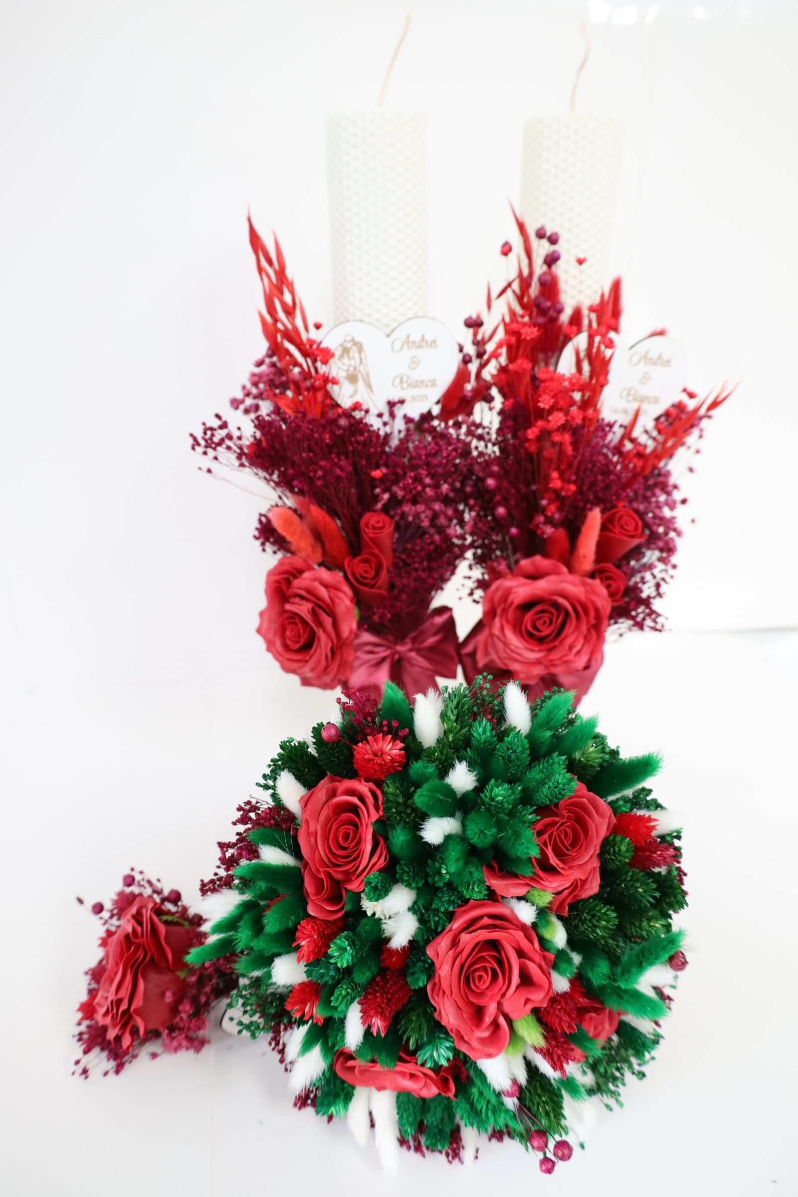 ✨ 2 lumânări elegante – decorate manual cu flori uscate și trandafiri de săpun. La cerere, lumânările pot fi personalizate cu numele mirilor și data evenimentului, pentru a deveni un simbol unic al nunții voastre.