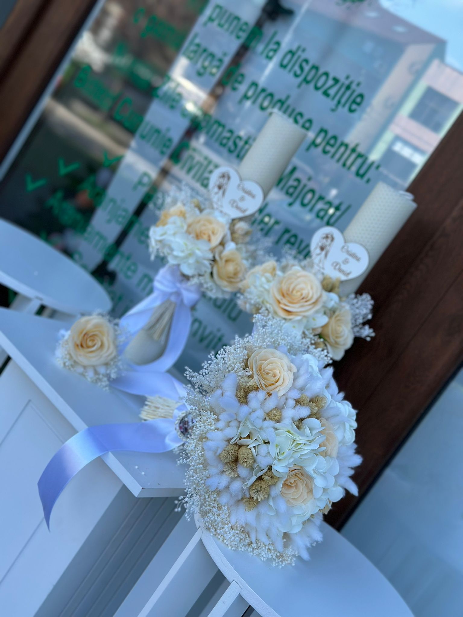 ✨ 2 lumânări elegante – decorate manual cu flori uscate și trandafiri de săpun. La cerere, lumânările pot fi personalizate cu numele mirilor și data evenimentului, pentru a deveni un simbol unic al nunții voastre.