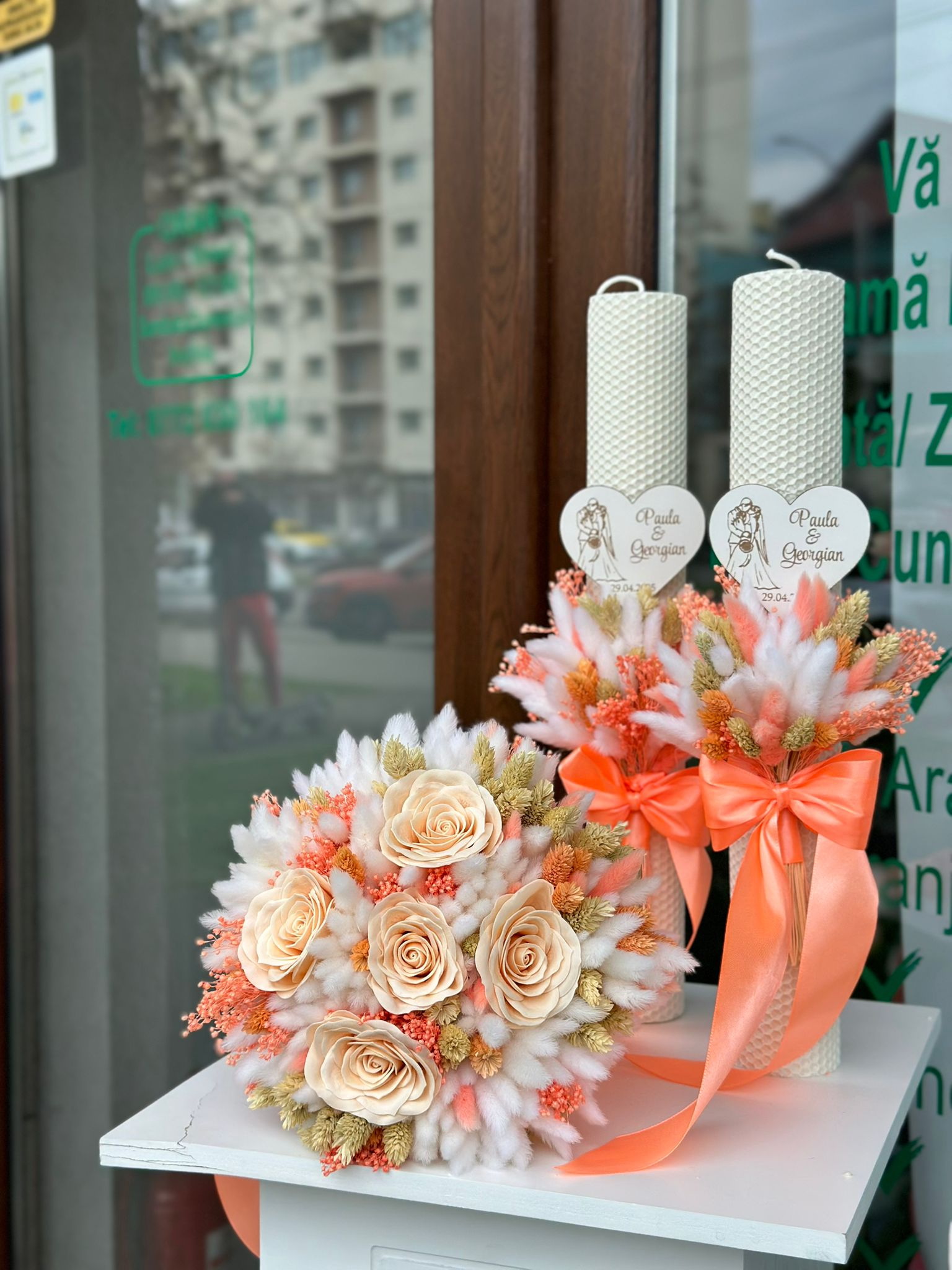 ✨ 2 lumânări elegante – decorate manual cu flori uscate și trandafiri de săpun. La cerere, lumânările pot fi personalizate cu numele mirilor și data evenimentului, pentru a deveni un simbol unic al nunții voastre.